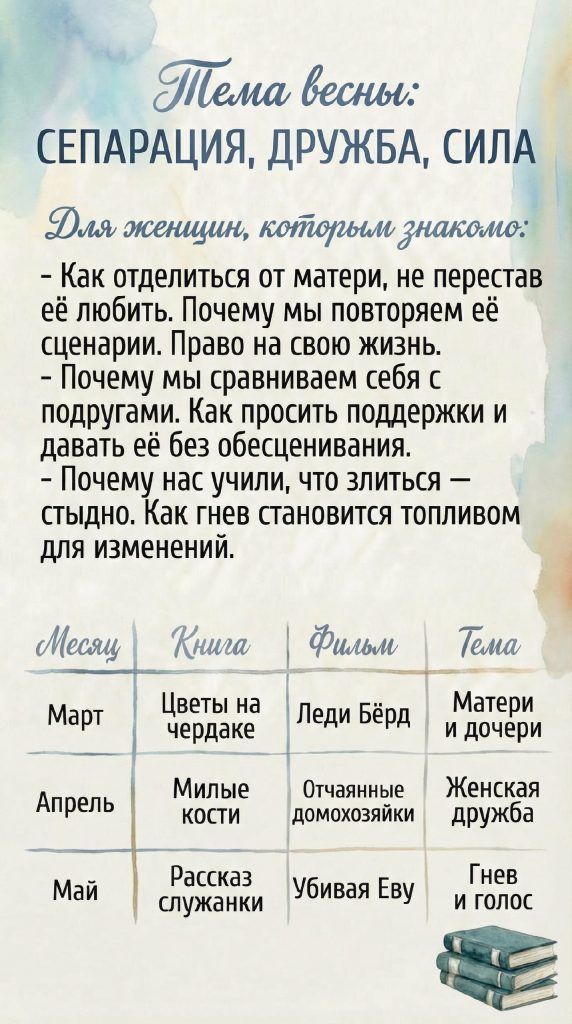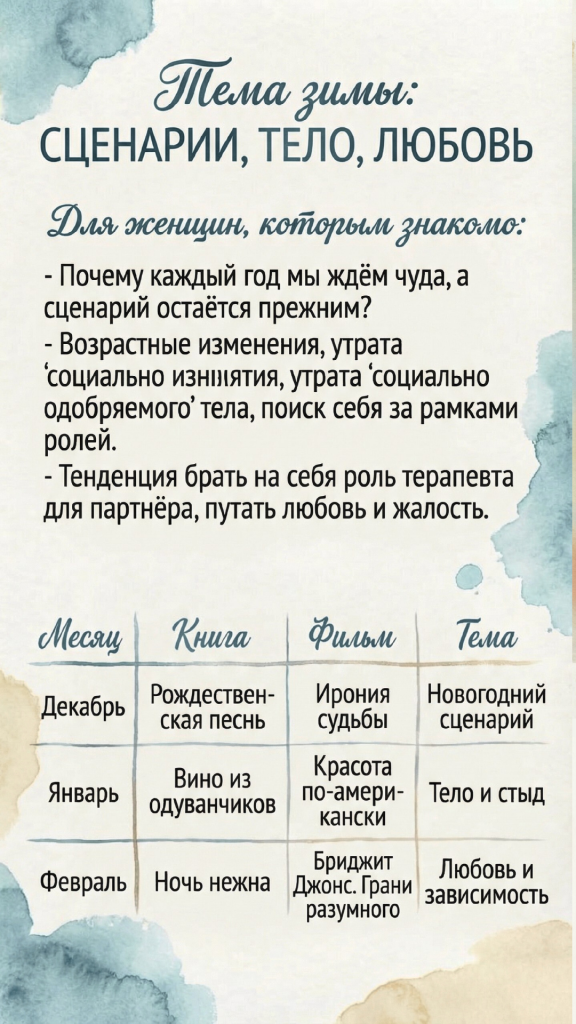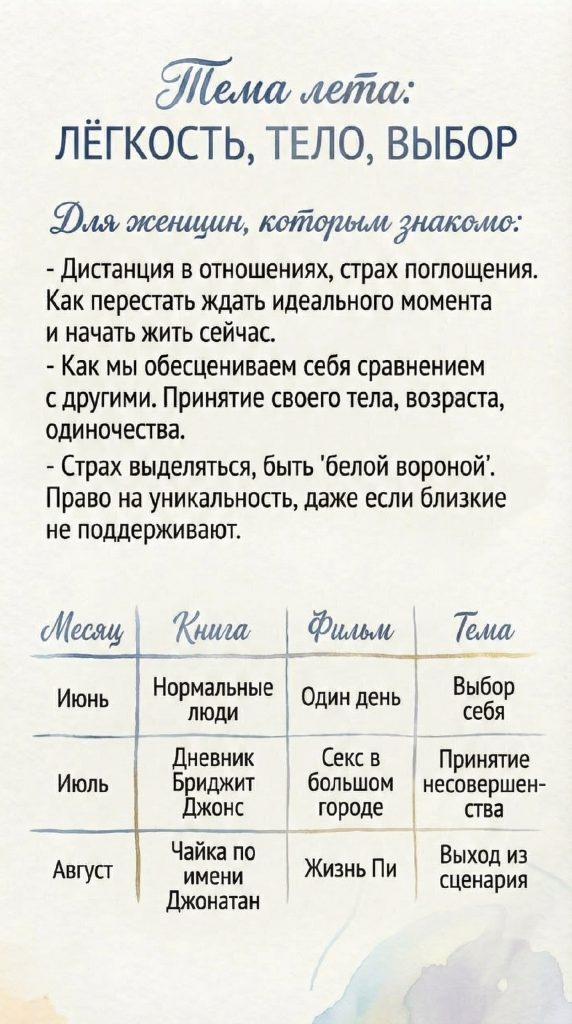 Рекомендации книг и фильмов на месяц. Короткие вопросы к себе. Аудиоразборы, кейс-сессии, общение.
