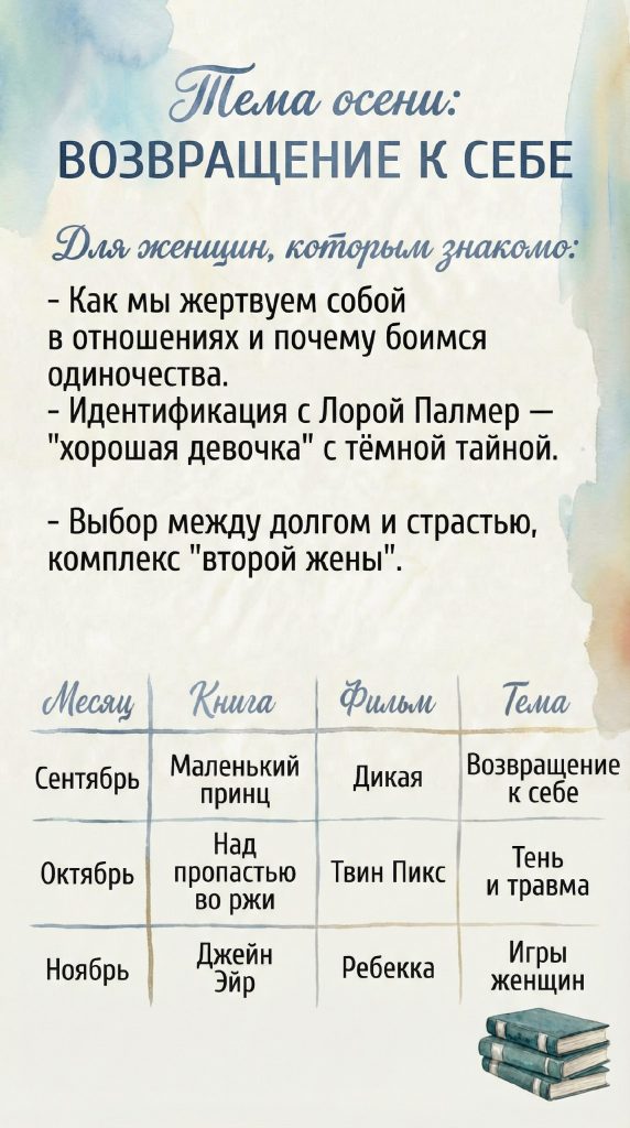 📌 1‑е число — анонс книги месяца и фильма + вопросы для самоанализа